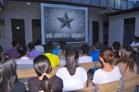 7月15日晚,廣通之家的小院內(nèi)座無(wú)虛席,黃陵縣店頭鎮(zhèn)文化站的同志正在為觀眾們播放紅色經(jīng)典電影《地雷戰(zhàn)》和《東進(jìn)序曲》,經(jīng)典的電影片段不時(shí)博得現(xiàn)場(chǎng)觀眾的熱烈掌聲和陣陣歡笑。